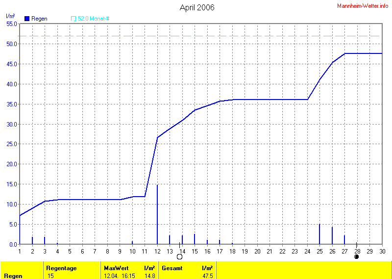 Die gesamte Regenmenge lag bei 47.5l/m² (entspricht: 91.4%) und war damit um -4.5l/m² vom langjährigen Wert entfernt. Niederschlag gab es an 15Tagen. Mehr als 2mm Regen gab es an 8Tagen. Sehr viel Regen mit mehr als 20mm pro Tag gab es an 0Tagen.