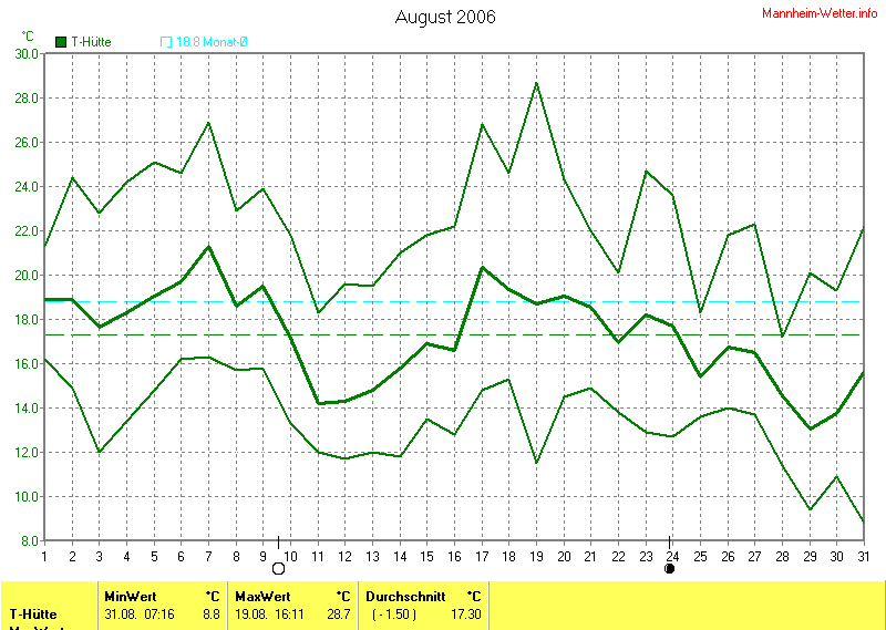 Der wärmste Tag war der 19.08.2006 um 16:11 mit 28.7°C. Am kältesten war es mit 8.8°C am 31.08.2006 um 07:16.