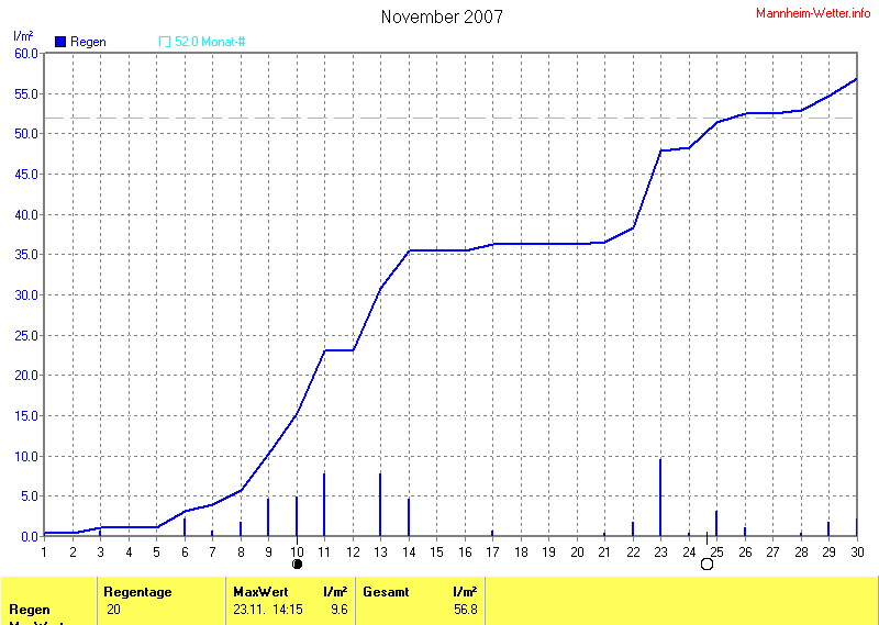 Dargestellt wird die grafische Übersicht für den Niederschlag. Zu sehen sind immer die täglichen Niederschlagsmengen (von 0-24 Uhr) und in der ansteigenden Linie die Summe aller Niederschläge: