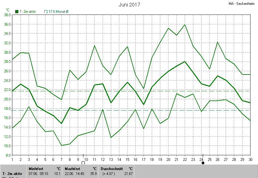 Der wärmste Tag war der 22.06.2017 um 14:40 mit 35.9°C. Am kältesten war es mit 10.1°C am 07.06.2017 um 05:10.