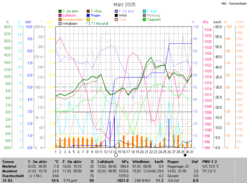 Die Durchschnittstemperatur für den Monat März 2025 lag bei 8.64°C. Die Abweichung vom langjährigen Mittel war +1.54°C.