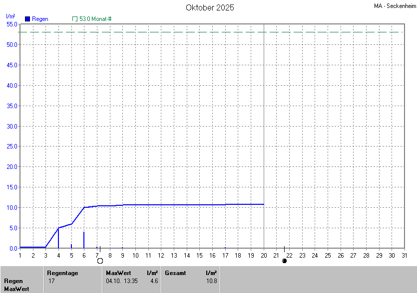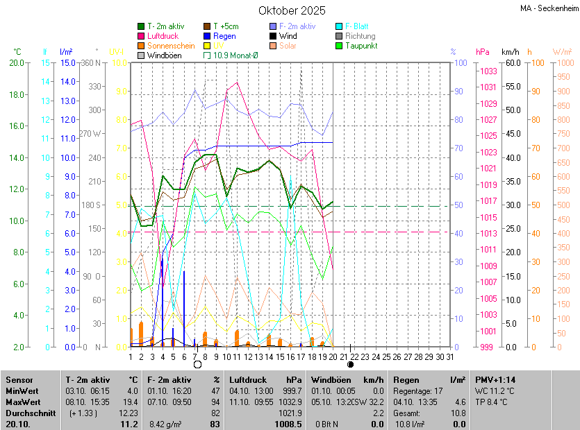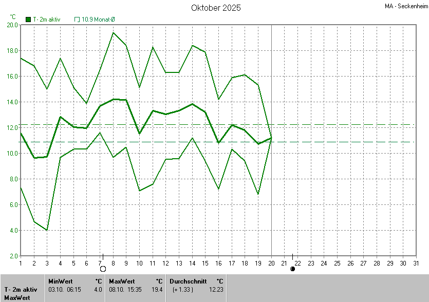 Der wärmste Tag war der 08.10.2025 um 15:35 mit 19.4°C. Am kältesten war es mit 4.0°C am 03.10.2025 um 06:15.