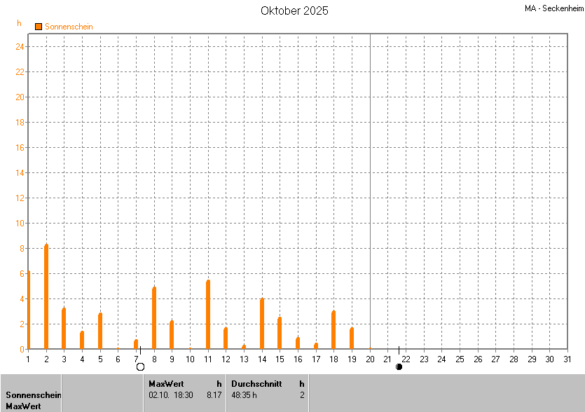 Dargestellt wird die grafische Übersicht für die Sonnenscheinzeit. Zu sehen sind immer die täglichen Sonnenstunden (von 0-24 Uhr):