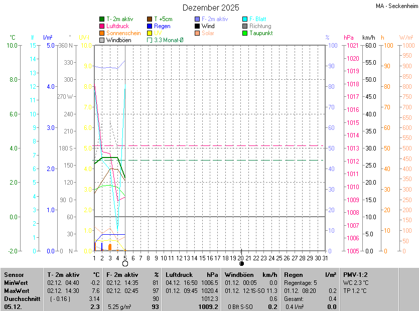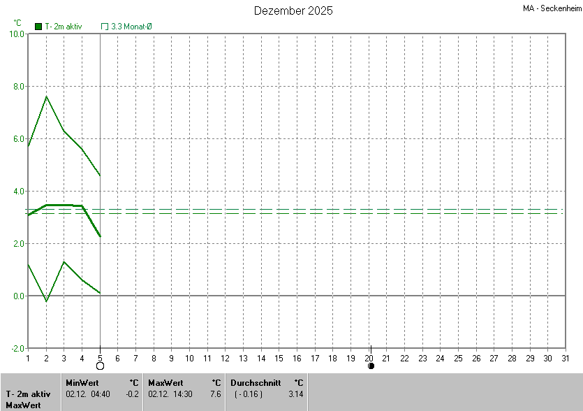 Die Durchschnittstemperatur für den Monat Dezember 2025 lag bei 3.14°C. Die Abweichung vom langjährigen Mittel war -0.16°C.
