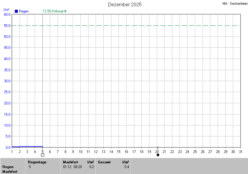 Die gesamte Regenmenge lag bei 0.4l/m² (entspricht: 0.7%) und war damit um -54.6l/m² vom langjährigen Wert entfernt. Niederschlag gab es an 2Tagen. Mehr als 2mm Regen gab es an 0Tagen. Sehr viel Regen mit mehr als 20mm pro Tag gab es an 0Tagen.