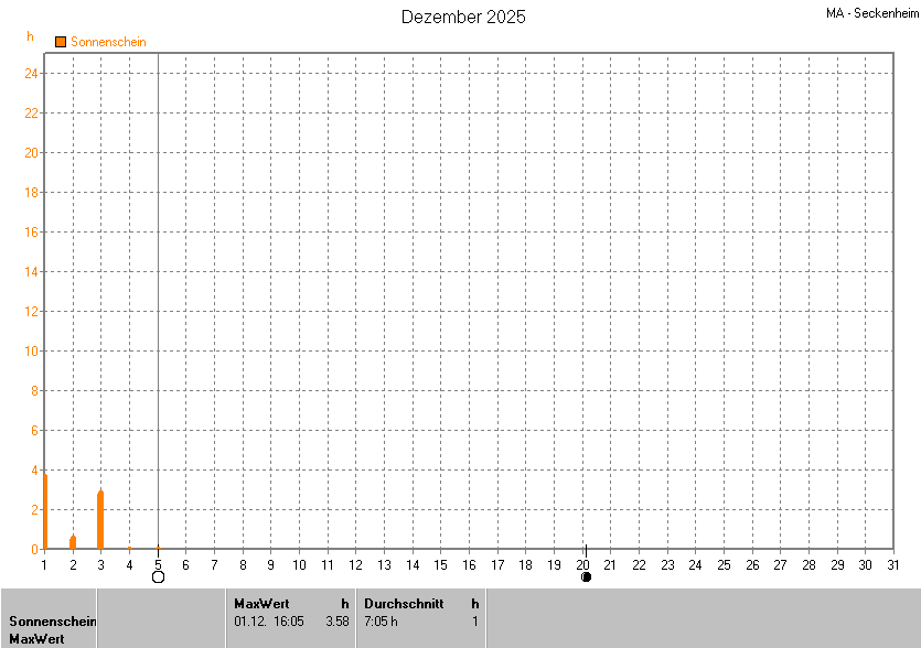 Dargestellt wird die grafische Übersicht für die Sonnenscheinzeit. Zu sehen sind immer die täglichen Sonnenstunden (von 0-24 Uhr):