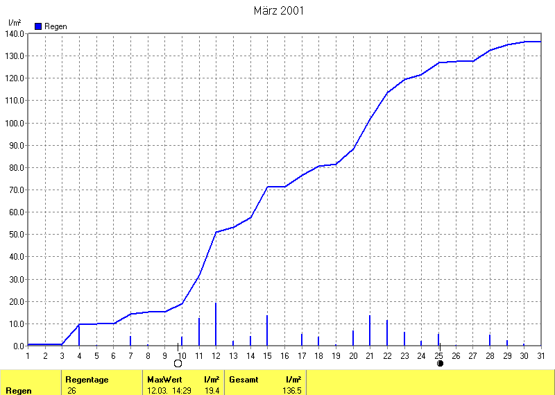 Der wärmste Tag war der 16.03.2001 um 15:24 mit 18.0°C. Am kältesten war es mit -1.9°C am 20.03.2001 um 06:49.