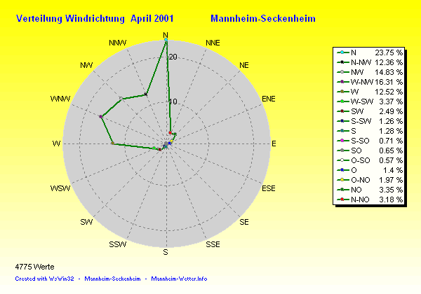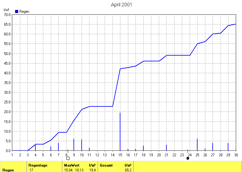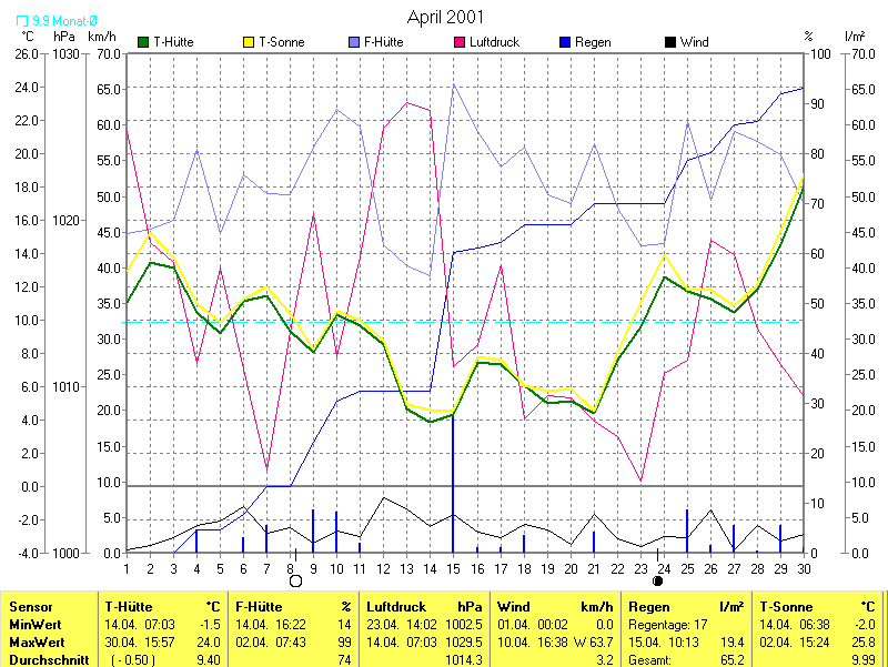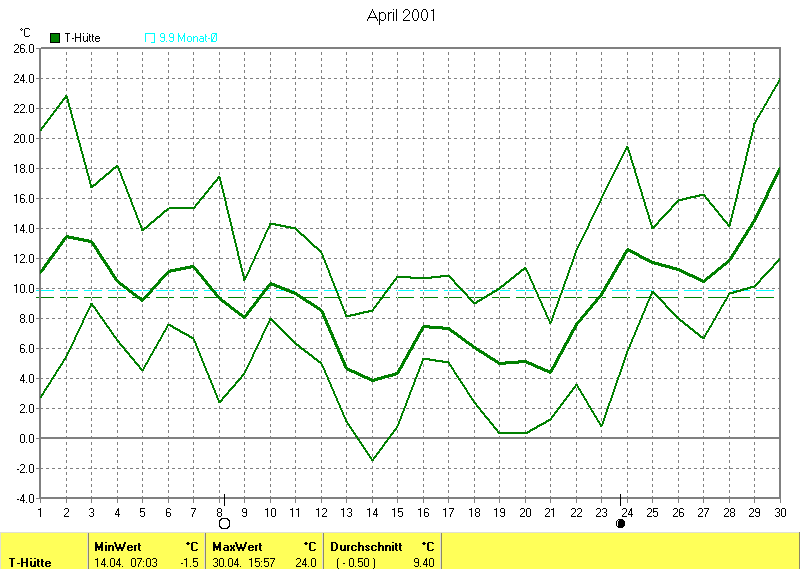 Der wärmste Tag war der 30.04.2001 um 15:57 mit 24.0°C. Am kältesten war es mit -1.5°C am 14.04.2001 um 07:03.