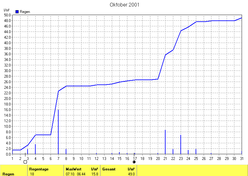 Der wärmste Tag war der 02.10.2001 um 16:23 mit 28.0°C. Am kältesten war es mit 6.2°C am 12.10.2001 um 07:28.