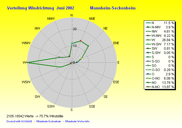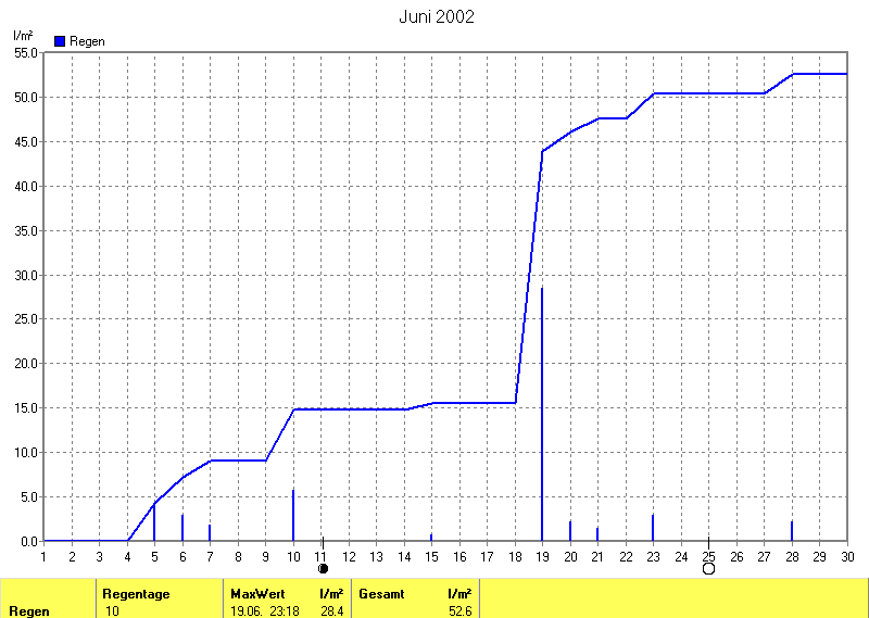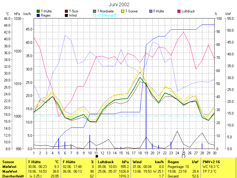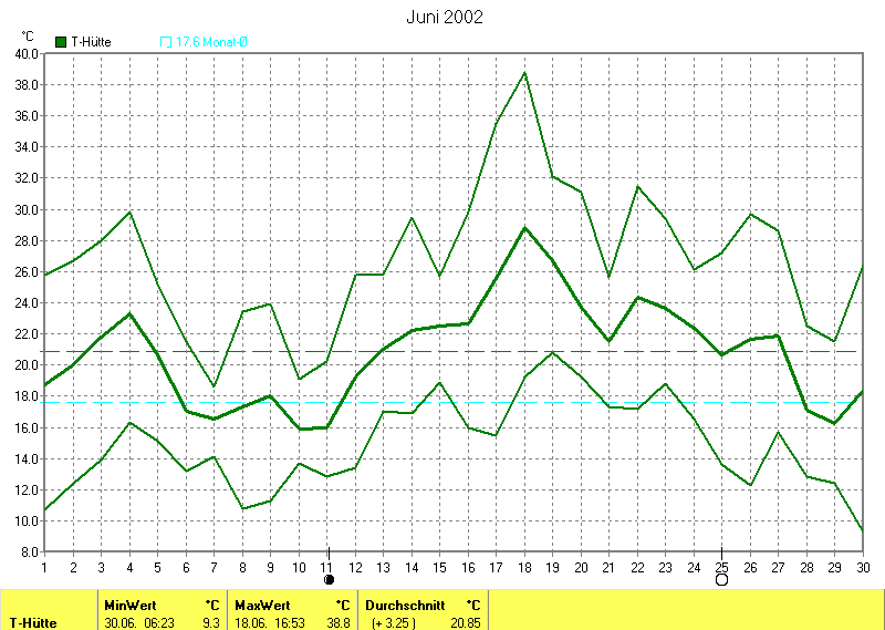 Der wärmste Tag war der 18.06.2002 um 16:53 mit 38.8°C. Am kältesten war es mit 9.3°C am 30.06.2002 um 06:23.