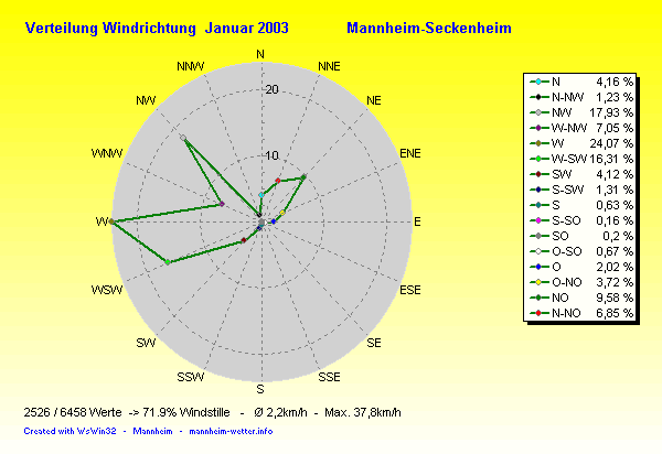 Der wärmste Tag war der 02.01.2003 um 04:53 mit 13.0°C. Am kältesten war es mit -11.4°C am 08.01.2003 um 07:44.