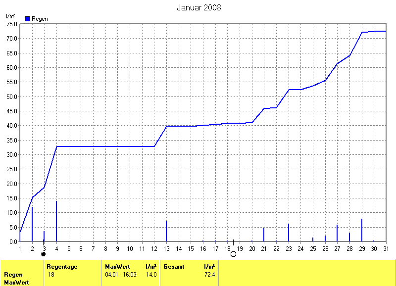 Dargestellt wird die grafische Übersicht für den Niederschlag. Zu sehen sind immer die täglichen Niederschlagsmengen (von 0-24 Uhr) und in der ansteigenden Linie die Summe aller Niederschläge: