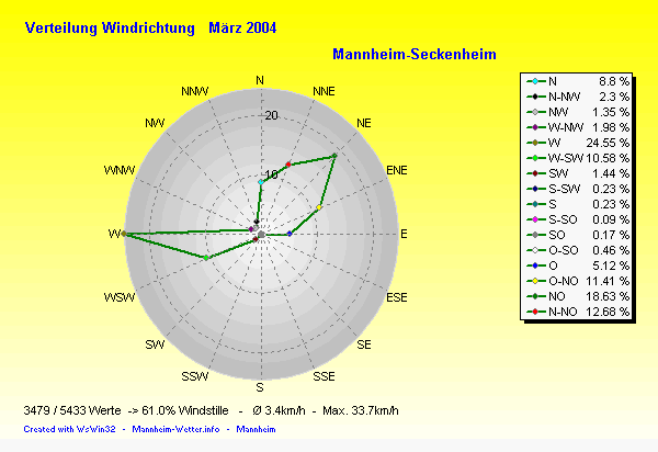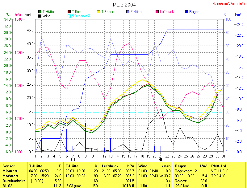 Der wärmste Tag war der 17.03.2004 um 15:28 mit 24.0°C. Am kältesten war es mit -3.9°C am 04.03.2004 um 06:53.