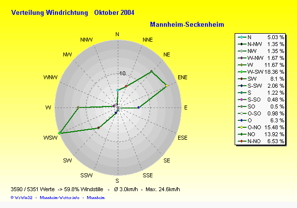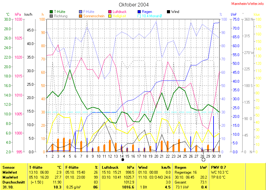 Der wärmste Tag war der 05.10.2004 um 16:20 mit 27.7°C. Am kältesten war es mit 2.9°C am 13.10.2004 um 06:00.