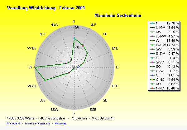 Der wärmste Tag war der 12.02.2005 um 18:20 mit 12.0°C. Am kältesten war es mit -10.4°C am 28.02.2005 um 06:49.