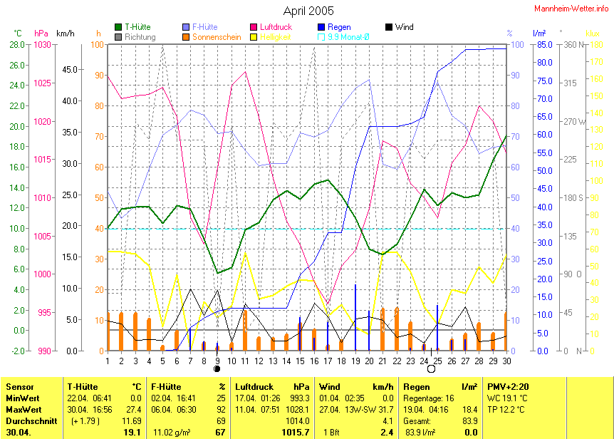 Der wärmste Tag war der 30.04.2005 um 16:56 mit 27.4°C. Am kältesten war es mit 0.0°C am 22.04.2005 um 06:41.