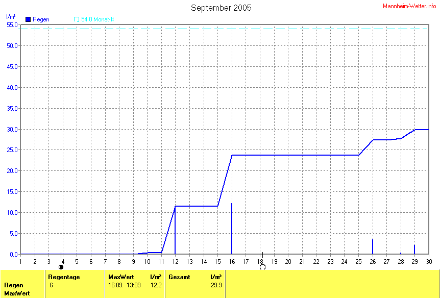 Der wärmste Tag war der 08.09.2005 um 15:49 mit 32.1°C. Am kältesten war es mit 5.0°C am 20.09.2005 um 06:50.