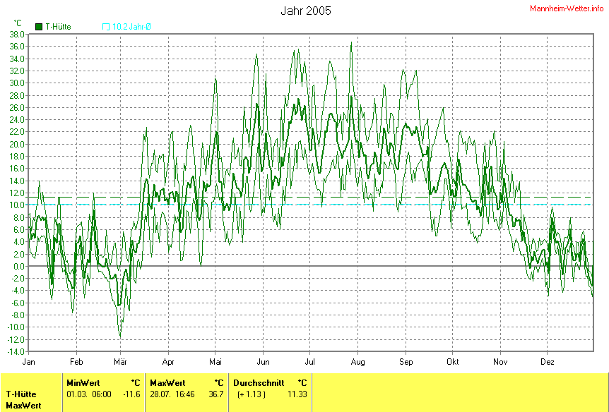 Am wärmsten war es am 28.07.2005 um 16:46 mit 36.7°C. Am kältesten mit -11.6°C am 01.03.2005 um 06:00.