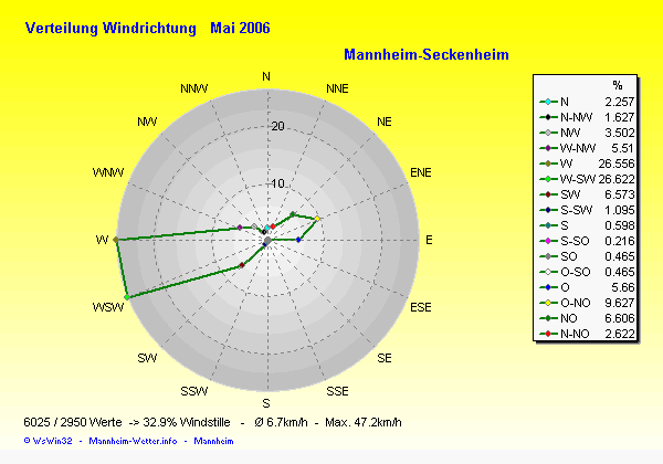 Der wärmste Tag war der 03.05.2006 um 16:36 mit 28.2°C. Am kältesten war es mit 5.0°C am 01.05.2006 um 06:45.