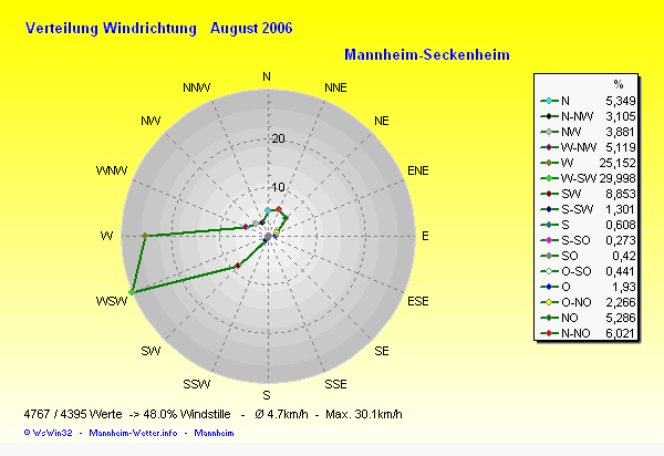 Der wärmste Tag war der 19.08.2006 um 16:11 mit 28.7°C. Am kältesten war es mit 8.8°C am 31.08.2006 um 07:16.