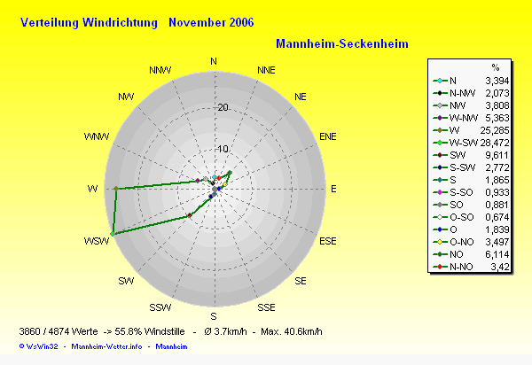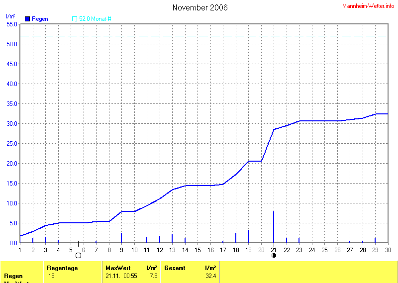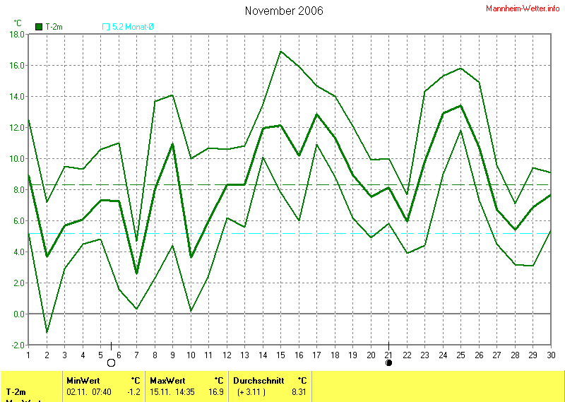 Der wärmste Tag war der 15.11.2006 um 14:35 mit 16.9°C. Am kältesten war es mit -1.2°C am 02.11.2006 um 07:40.