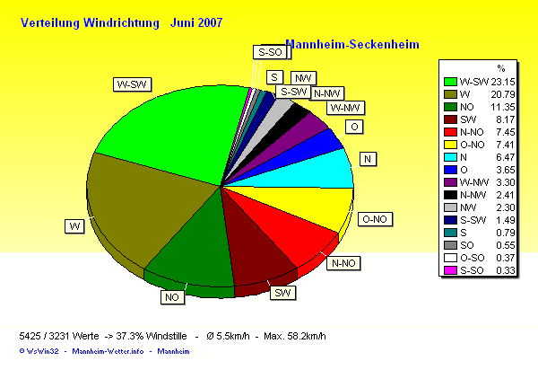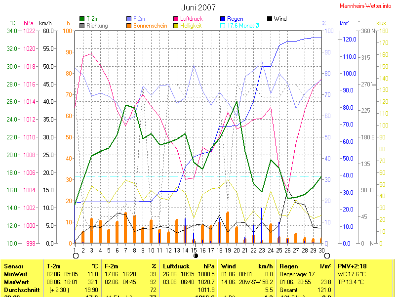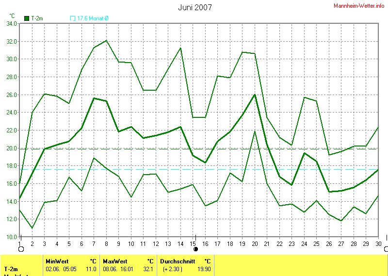 Der wärmste Tag war der 08.06.2007 um 16:01 mit 32.1°C. Am kältesten war es mit 11.0°C am 02.06.2007 um 05:05.