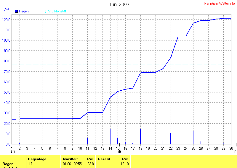 Die gesamte Regenmenge lag bei 121.0l/m² (entspricht: 157.2%) und war damit um +44.0l/m² vom langjährigen Wert entfernt. Niederschlag gab es an 17Tagen. Mehr als 2mm Regen gab es an 11Tagen. Sehr viel Regen mit mehr als 20mm pro Tag gab es an 2Tagen.
