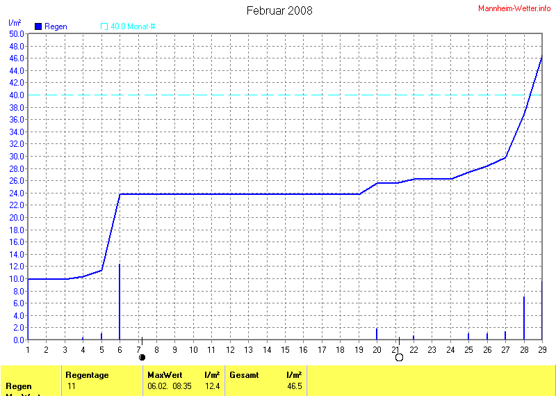 Die gesamte Regenmenge lag bei 46.5l/m² (entspricht: 116.3%) und war damit um +6.5l/m² vom langjährigen Wert entfernt. Niederschlag gab es an 11Tagen. Mehr als 2mm Regen gab es an 4Tagen. Sehr viel Regen mit mehr als 20mm pro Tag gab es an 0Tagen.