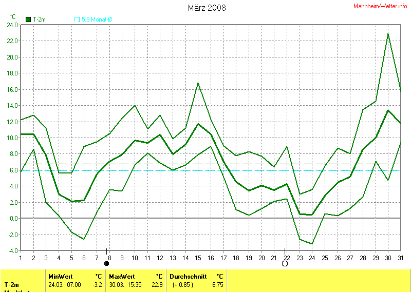 Der wärmste Tag war der 30.03.2008 um 15:35 mit 22.9°C. Am kältesten war es mit -3.2°C am 24.03.2008 um 07:00.
