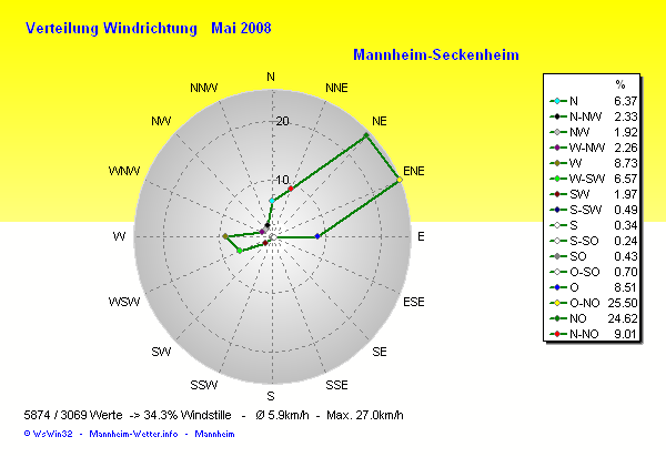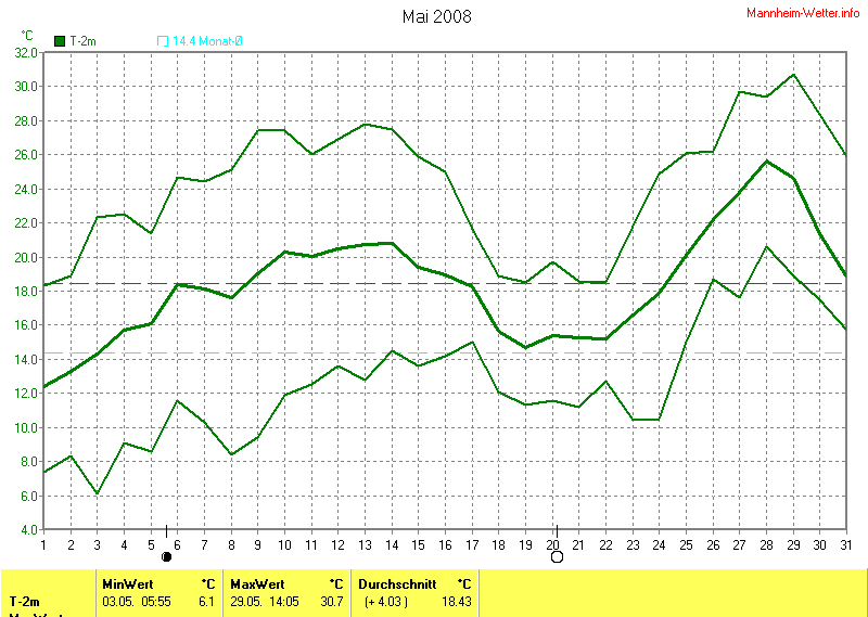 Die Durchschnittstemperatur für den Monat Mai 2008 lag bei 18.43°C. Die Abweichung vom langjährigen Mittel war +4.03°C.