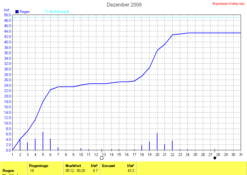 Die gesamte Regenmenge lag bei 43.3l/m² (entspricht: 88.4%) und war damit um -5.7l/m² vom langjährigen Wert entfernt. Niederschlag gab es an 18Tagen. Mehr als 2mm Regen gab es an 9Tagen. Sehr viel Regen mit mehr als 20mm pro Tag gab es an 0Tagen.