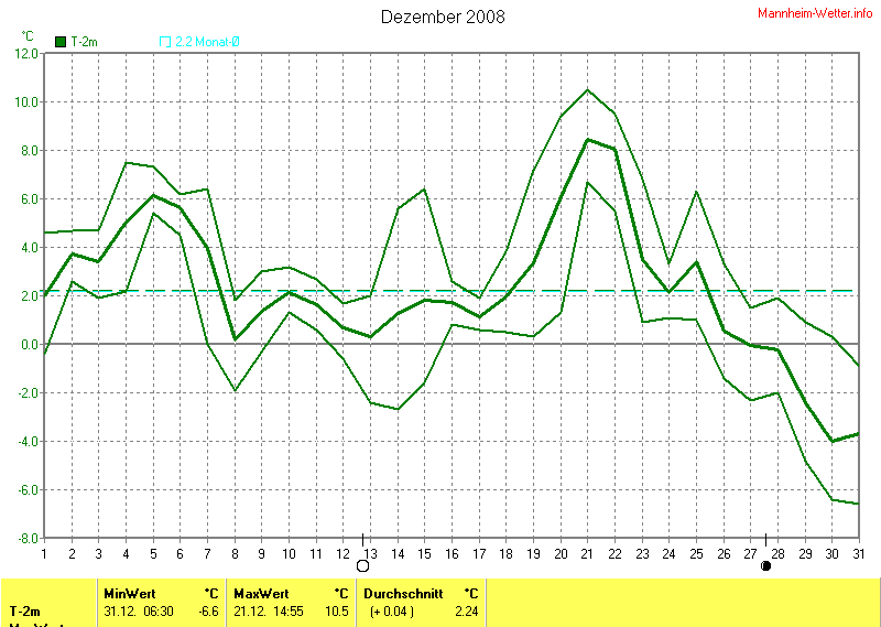 Der wärmste Tag war der 21.12.2008 um 14:55 mit 10.5°C. Am kältesten war es mit -6.6°C am 31.12.2008 um 06:30.