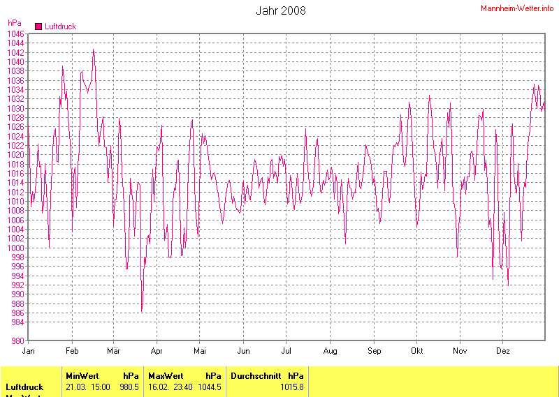 Am wärmsten war es am 02.07.2008 um 16:15 mit 35.3°C. Am kältesten mit -6.6°C am 31.12.2008 um 06:30.