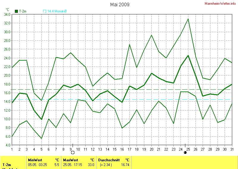 Der wärmste Tag war der 25.05.2009 um 17:15 mit 33.0°C. Am kältesten war es mit 5.5°C am 05.05.2009 um 03:25.