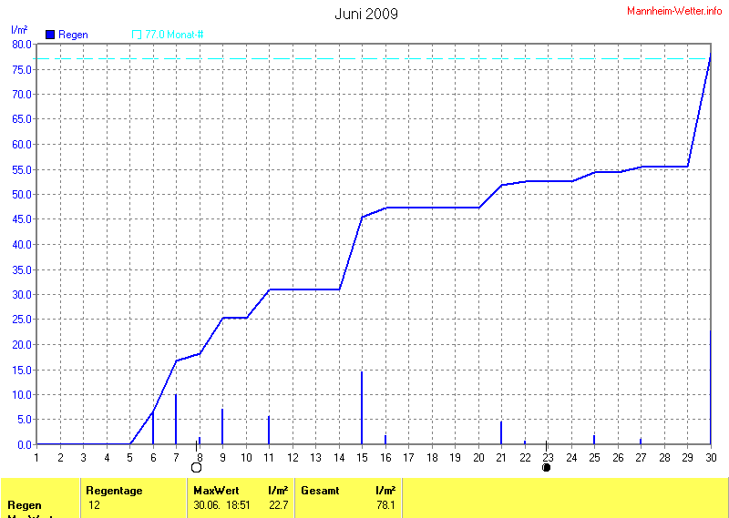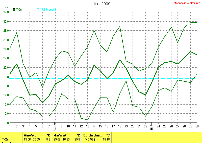 Die Durchschnittstemperatur für den Monat Juni 2009 lag bei 18.17°C. Die Abweichung vom langjährigen Mittel war +0.57°C.