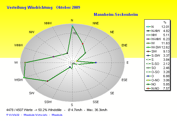 Die Durchschnittstemperatur für den Monat Oktober 2009 lag bei 10.56°C. Die Abweichung vom langjährigen Mittel war +0.16°C.