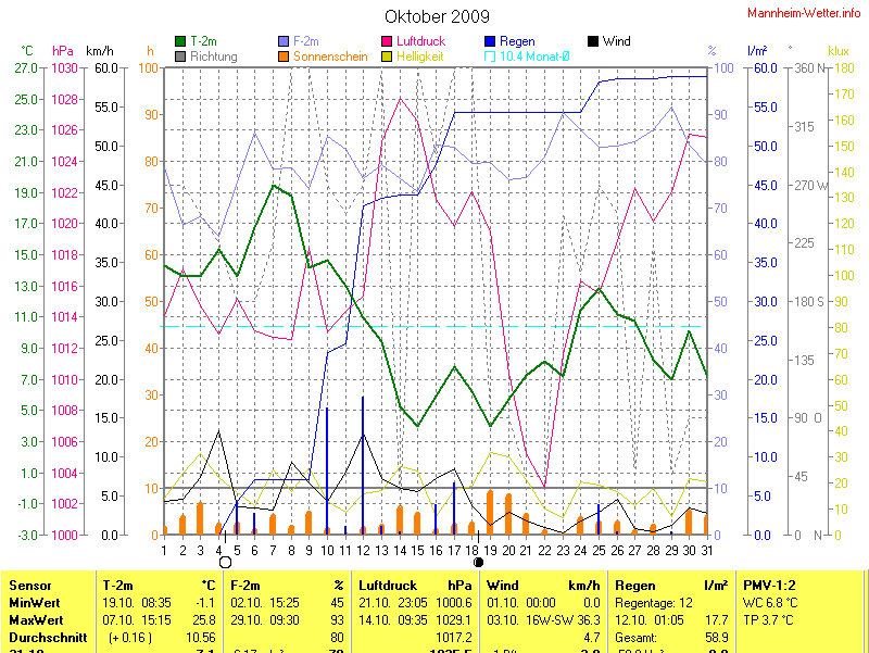 Der wärmste Tag war der 07.10.2009 um 15:15 mit 25.8°C. Am kältesten war es mit -1.1°C am 19.10.2009 um 08:35.