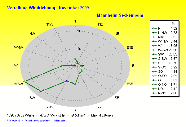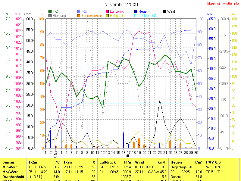Die Durchschnittstemperatur für den Monat November 2009 lag bei 9.04°C. Die Abweichung vom langjährigen Mittel war +3.84°C.