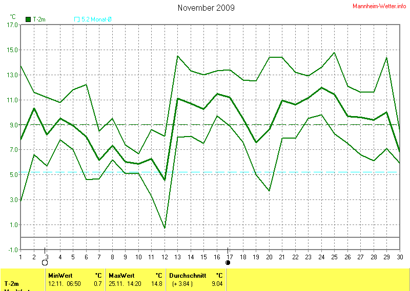 Der wärmste Tag war der 25.11.2009 um 14:20 mit 14.8°C. Am kältesten war es mit 0.7°C am 12.11.2009 um 06:50.