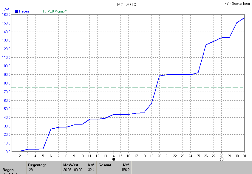 Die gesamte Regenmenge lag bei 156.2l/m² (entspricht: 208.3%) und war damit um +81.2l/m² vom langjährigen Wert entfernt. Niederschlag gab es an 24Tagen. Mehr als 2mm Regen gab es an 12Tagen. Sehr viel Regen mit mehr als 20mm pro Tag gab es an 3Tagen.