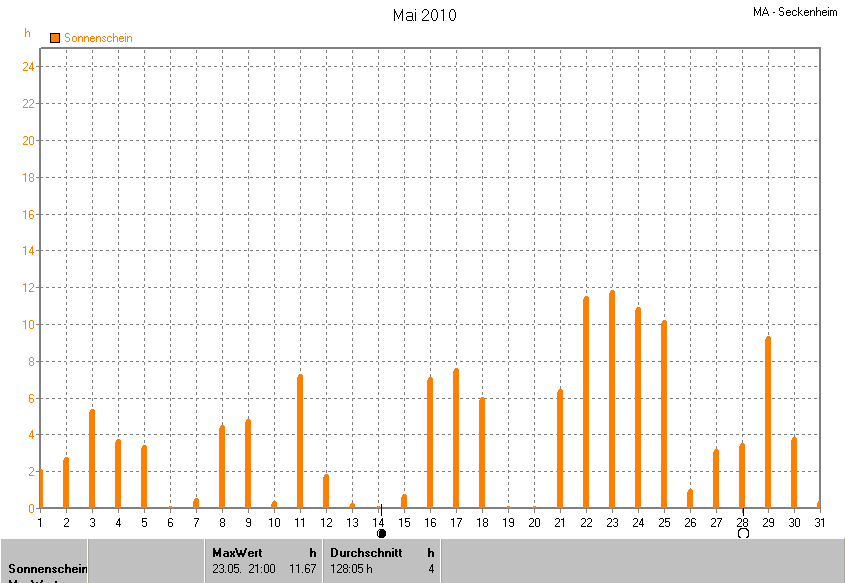 Dargestellt wird die grafische Übersicht für die Sonnenscheinzeit. Zu sehen sind immer die täglichen Sonnenstunden (von 0-24 Uhr):