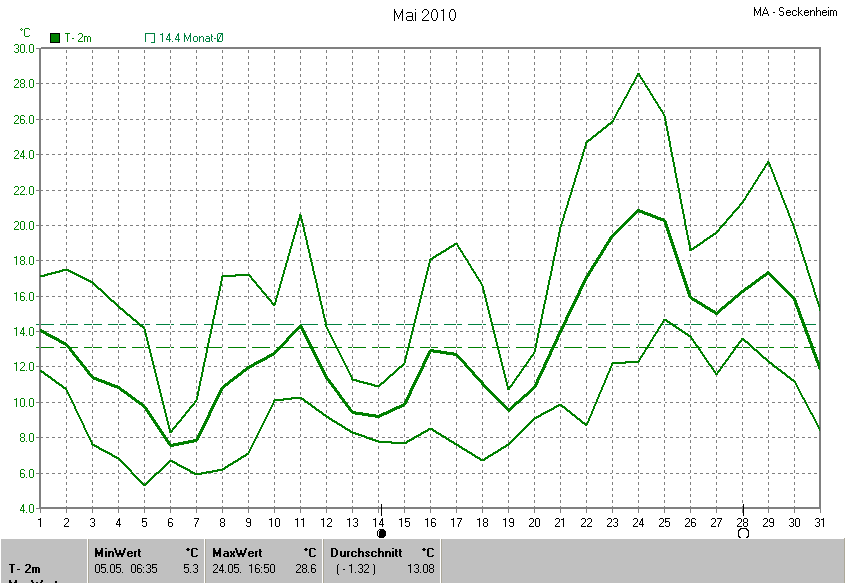 Die Durchschnittstemperatur für den Monat Mai 2010 lag bei 13.08°C. Die Abweichung vom langjährigen Mittel war -1.32°C.