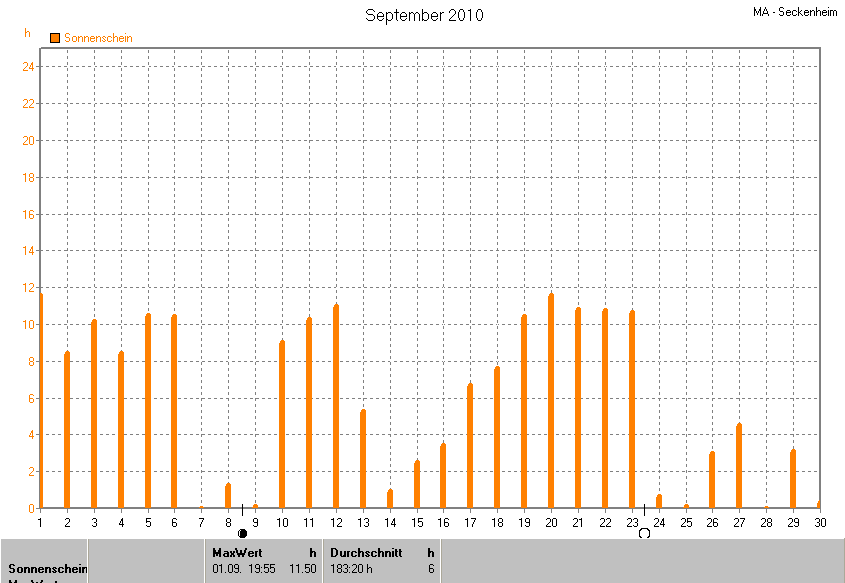 Dargestellt wird die grafische Übersicht für die Sonnenscheinzeit. Zu sehen sind immer die täglichen Sonnenstunden (von 0-24 Uhr):