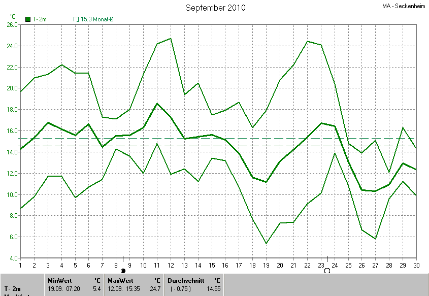 Der wärmste Tag war der 12.09.2010 um 15:35 mit 24.7°C. Am kältesten war es mit 5.4°C am 19.09.2010 um 07:20.