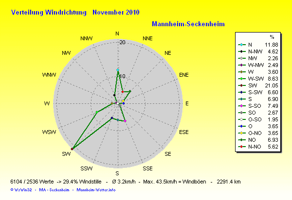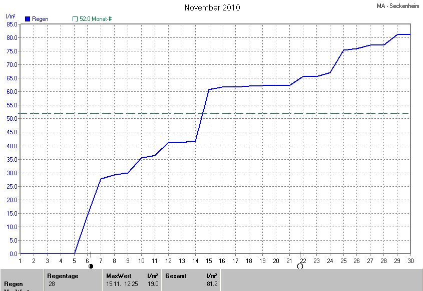 Die Durchschnittstemperatur für den Monat November 2010 lag bei 7.52°C. Die Abweichung vom langjährigen Mittel war +2.32°C.