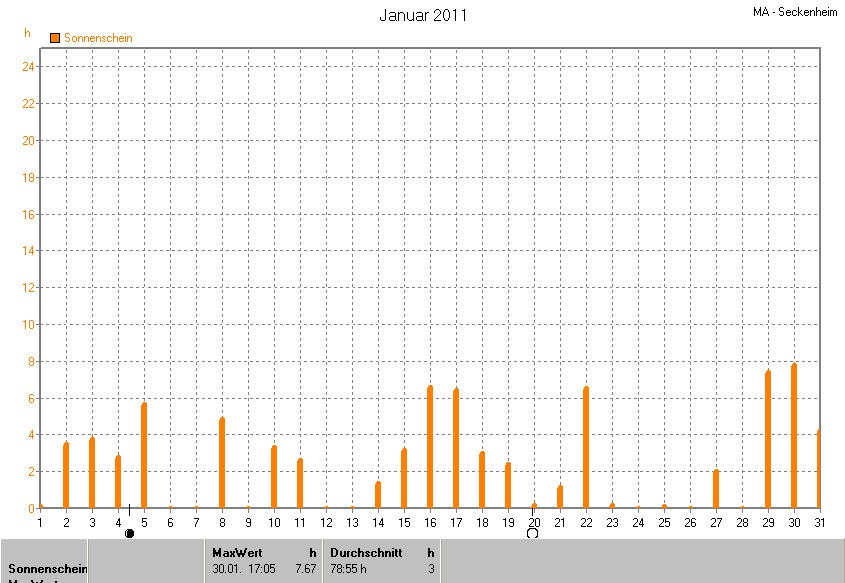 Dargestellt wird die grafische Übersicht für die Sonnenscheinzeit. Zu sehen sind immer die täglichen Sonnenstunden (von 0-24 Uhr):