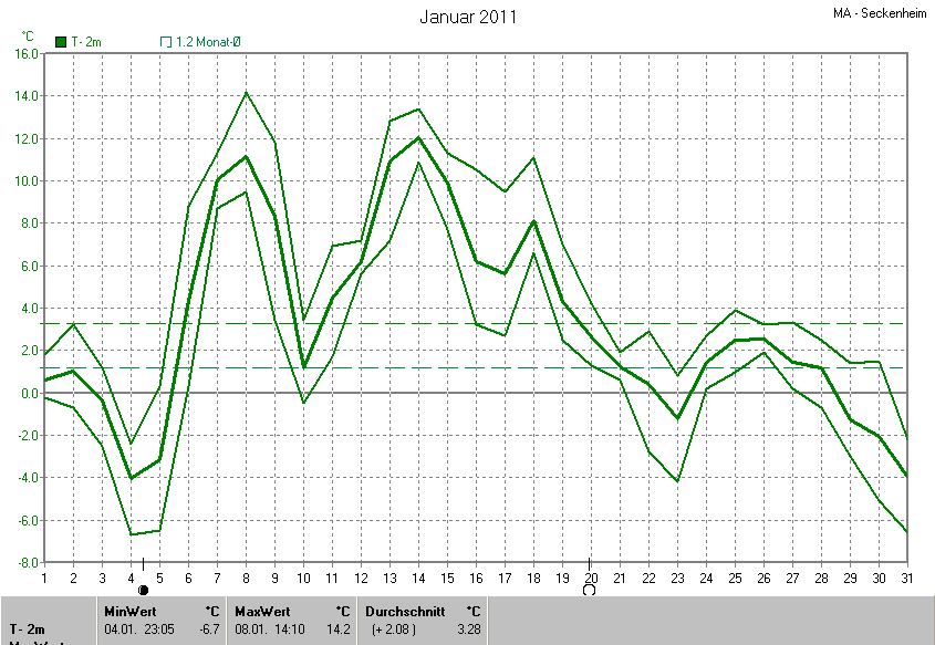 Die Durchschnittstemperatur für den Monat Januar 2011 lag bei 3.28°C. Die Abweichung vom langjährigen Mittel war +2.08°C.