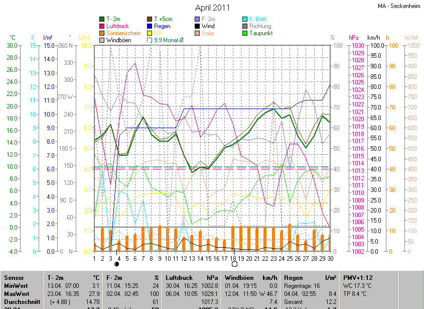 Der wärmste Tag war der 23.04.2011 um 16:35 mit 27.9°C. Am kältesten war es mit 3.1°C am 13.04.2011 um 07:00.