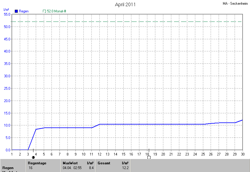 Die Durchschnittstemperatur für den Monat April 2011 lag bei 14.78°C. Die Abweichung vom langjährigen Mittel war +4.88°C.