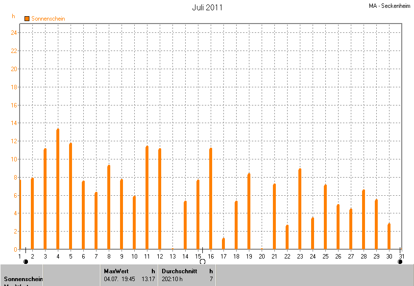 Dargestellt wird die grafische Übersicht für die Sonnenscheinzeit. Zu sehen sind immer die täglichen Sonnenstunden (von 0-24 Uhr):